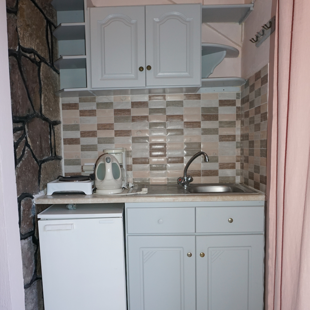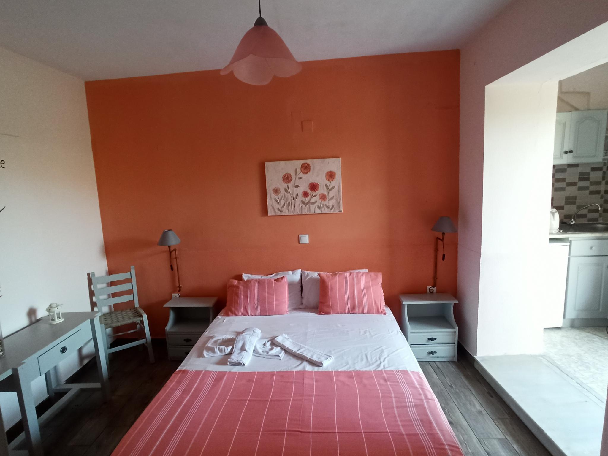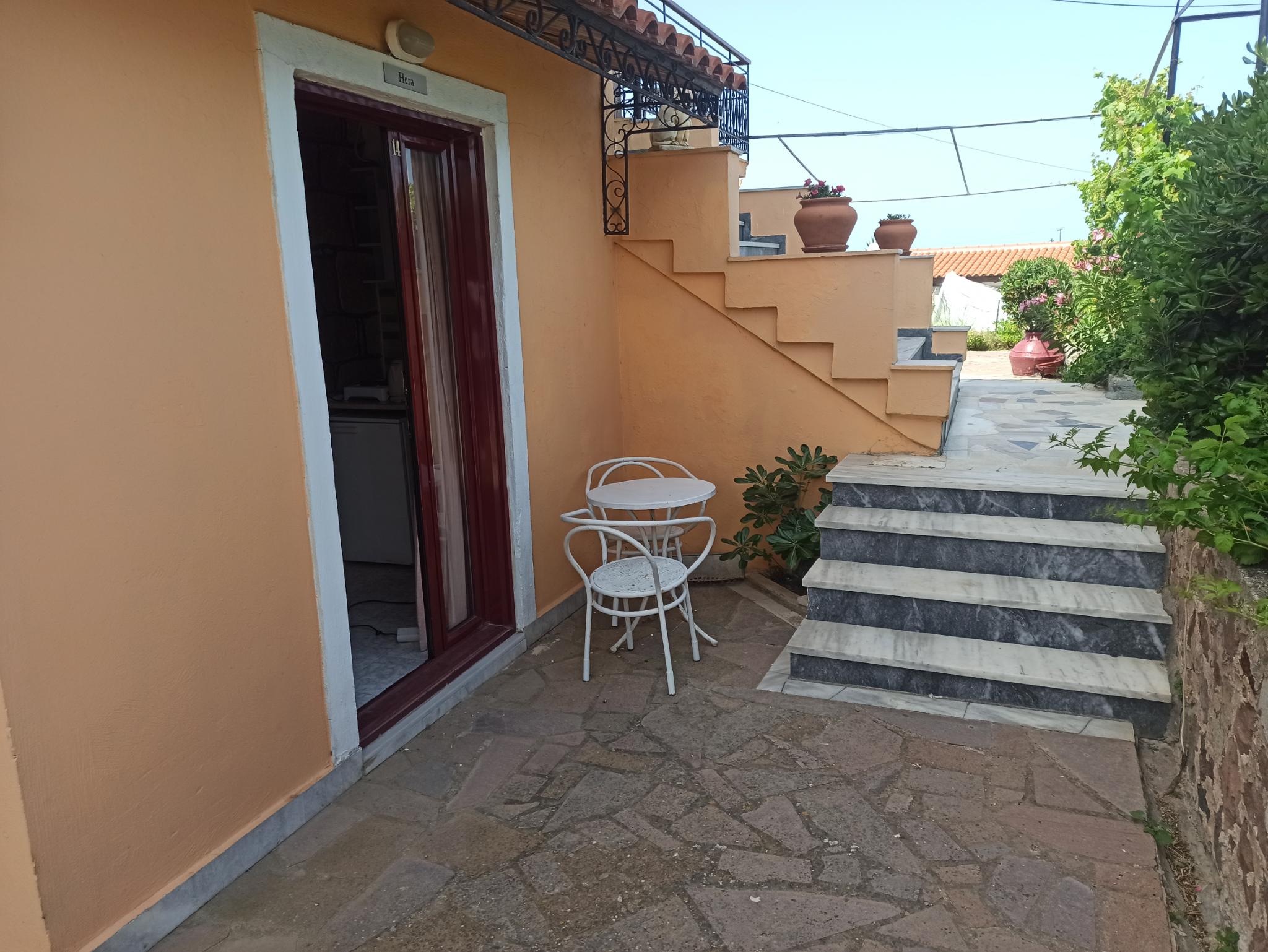 This studio with a mini kitchen and a bathroom is located on the ground floor of the guest house with a view towards the garden and the sea.