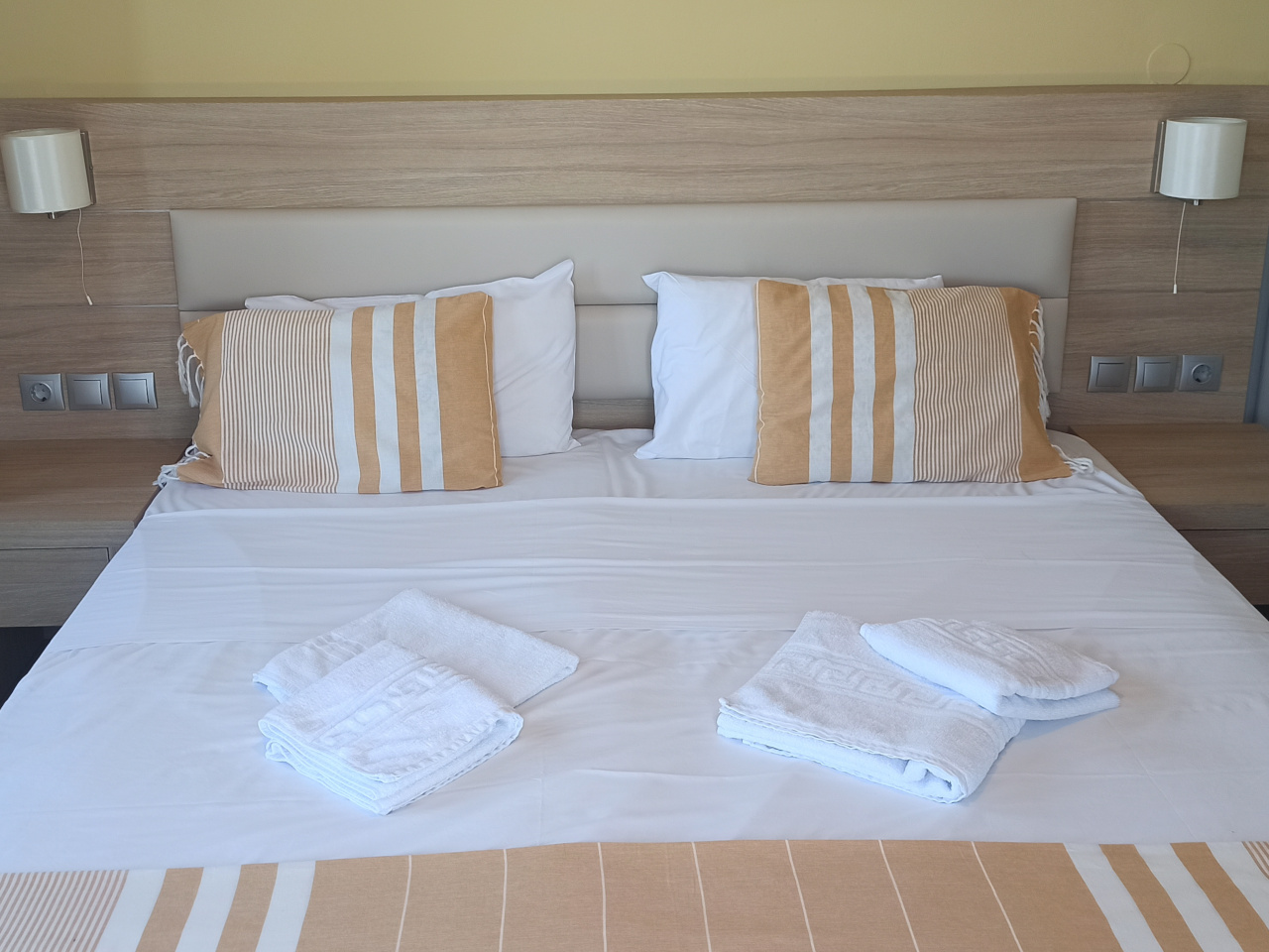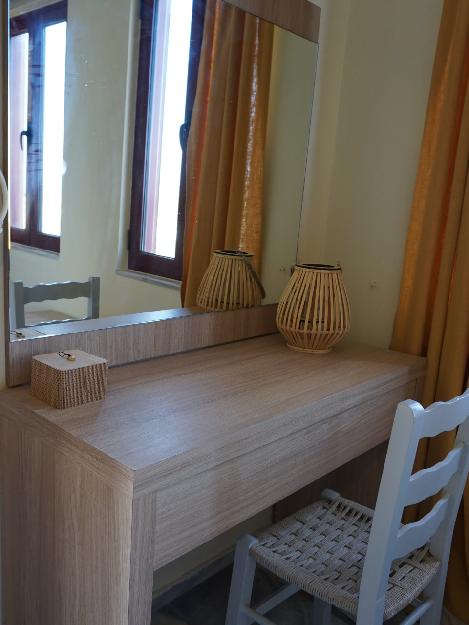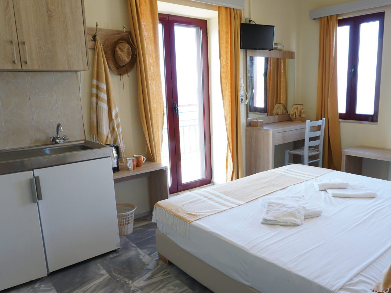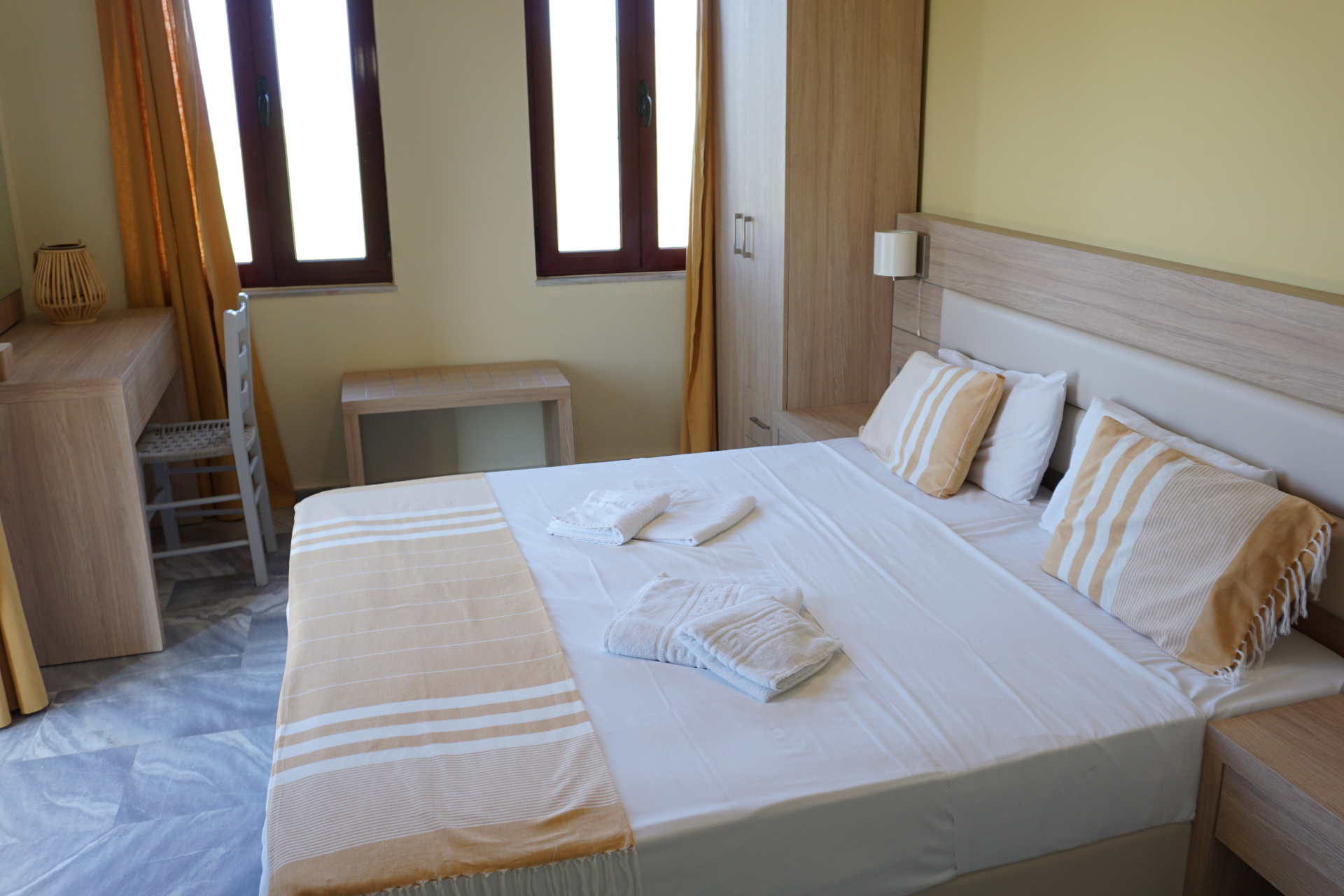 - Ausstattungen: Bettwäsche, Frisiertisch, Handtücher, Miniküche, Strandtücher, Wasserkocher